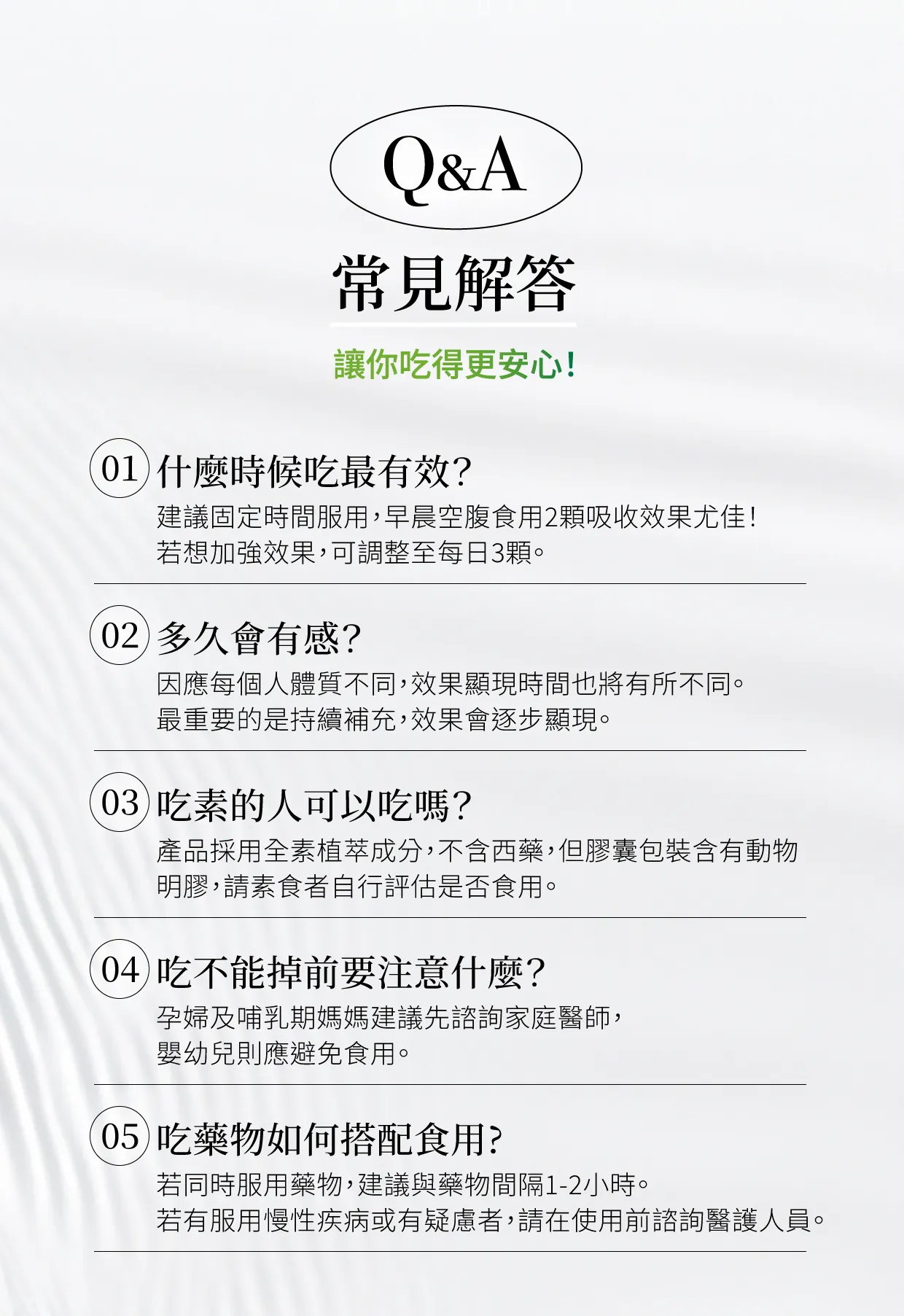 建議固定時間服用,早晨空腹食用2顆吸收效果尤佳!若想加強效果,可調整至每日3顆。